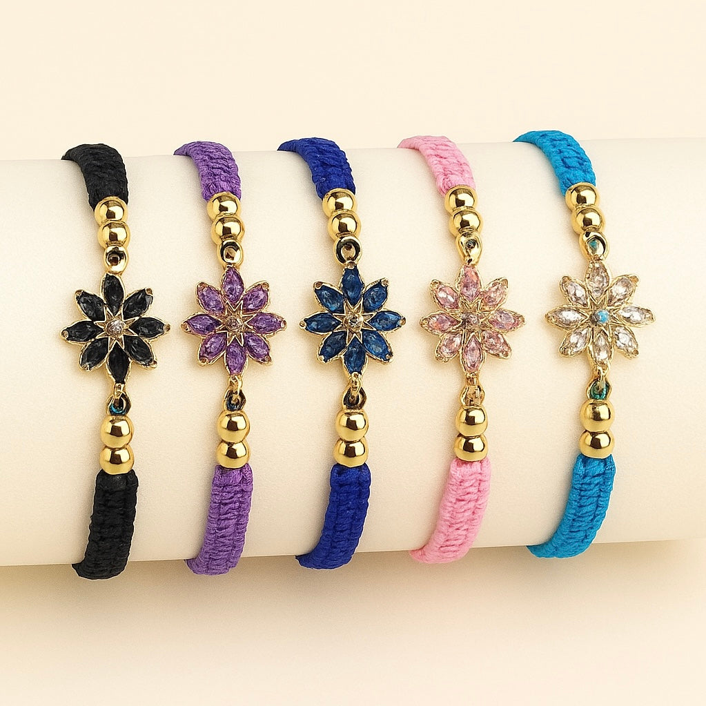 • Materiales: Hilo coreano de alta resistencia, balines en oro laminado.